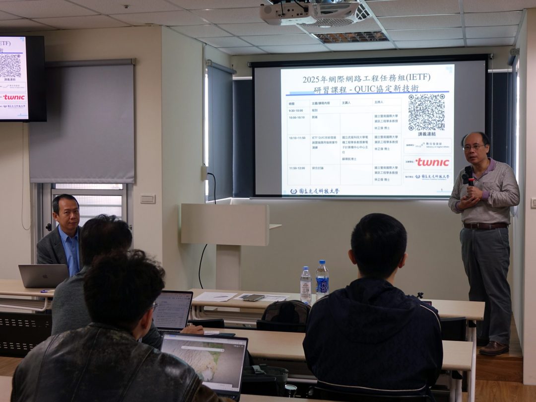 由數位發展部指導、財團法人台灣網路資訊中心(TWNIC)主辦之「2025年網際網路工程任務組(IETF)研習課程–QUIC協定新技術」,於 民國114年12月1日(一),假新竹縣竹北市高鐵七路65號12樓之2(惠友遠見大樓)順利舉行。本次以QUIC技術實作工作坊形式辦理,聚焦IETF QUIC標準發展、實務部署情境與雲端應用服務整合,協助參與者全面掌握次世代網路傳輸協定的運作核心。